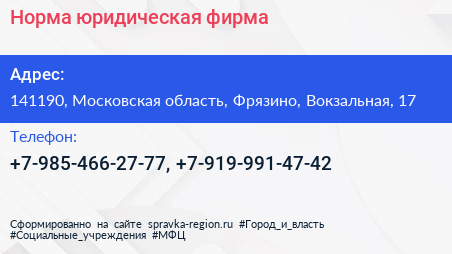 Норма, юридическая фирма по адресу 141190, Московская область, Фрязино, Вокзальная, 17 в дальнейшем Организация, размещена в следующих категориях: