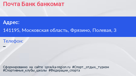 Почта Банк, банкомат по адресу 141195, Московская область, Фрязино, Полевая, 3 в дальнейшем Организация, размещена в следующих категориях: