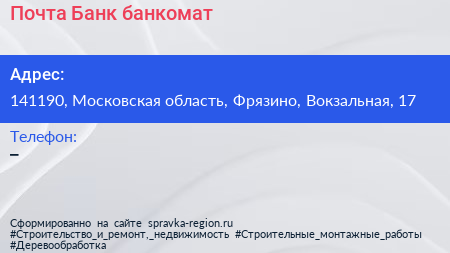 Почта Банк, банкомат по адресу 141190, Московская область, Фрязино, Вокзальная, 17 в дальнейшем Организация, размещена в следующих категориях: