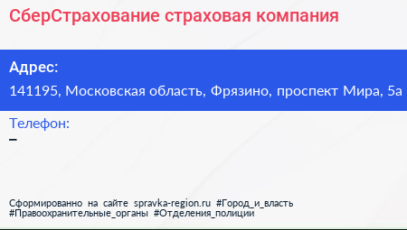 СберСтрахование, страховая компания по адресу 141195, Московская область, Фрязино, проспект Мира, 5а в дальнейшем Организация, размещена в следующих категориях: