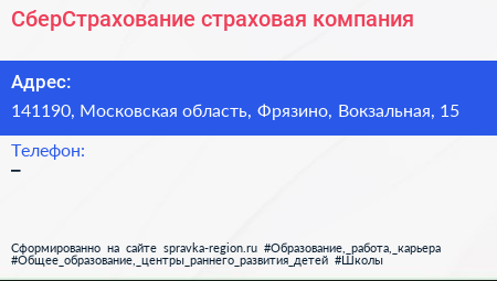 СберСтрахование, страховая компания по адресу 141190, Московская область, Фрязино, Вокзальная, 15 в дальнейшем Организация, размещена в следующих категориях: