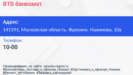 ВТБ, банкомат по адресу 141191, Московская область, Фрязино, Нахимова, 10а в дальнейшем Организация, размещена в следующих категориях:
