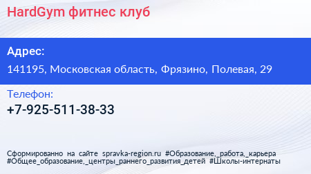 HardGym, фитнес-клуб по адресу 141195, Московская область, Фрязино, Полевая, 29 в дальнейшем Организация, размещена в следующих категориях: