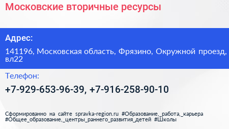 Московские вторичные ресурсы по адресу 141196, Московская область, Фрязино, Окружной проезд, вл22 в дальнейшем Организация, размещена в следующих категориях: