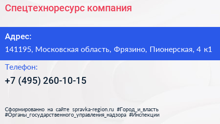 Спецтехноресурс, компания по адресу 141195, Московская область, Фрязино, Пионерская, 4 к1 в дальнейшем Организация, размещена в следующих категориях: