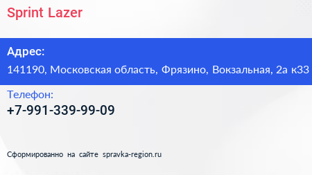 Sprint Lazer по адресу 141190, Московская область, Фрязино, Вокзальная, 2а к33 в дальнейшем Организация, размещена в следующих категориях: