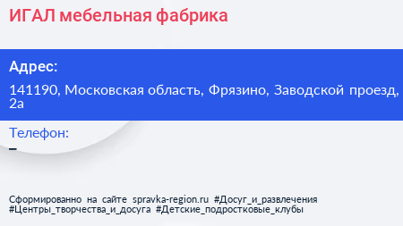 ИГАЛ, мебельная фабрика по адресу 141190, Московская область, Фрязино, Заводской проезд, 2а в дальнейшем Организация, размещена в следующих категориях: