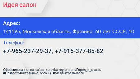 Идея, салон по адресу 141195, Московская область, Фрязино, 60 лет СССР, 10 в дальнейшем Организация, размещена в следующих категориях: