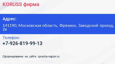 KORUSS, фирма по адресу 141190, Московская область, Фрязино, Заводской проезд, 2в в дальнейшем Организация, размещена в следующих категориях: