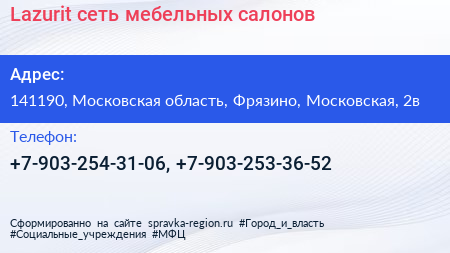 Lazurit, сеть мебельных салонов по адресу 141190, Московская область, Фрязино, Московская, 2в в дальнейшем Организация, размещена в следующих категориях: