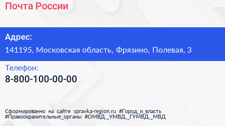 Почта России по адресу 141195, Московская область, Фрязино, Полевая, 3 в дальнейшем Организация, размещена в следующих категориях: