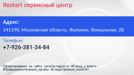 Restart, сервисный центр по адресу 141190, Московская область, Фрязино, Вокзальная, 2Б в дальнейшем Организация, размещена в следующих категориях: