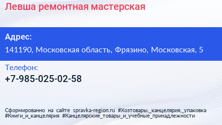 Левша, ремонтная мастерская по адресу 141190, Московская область, Фрязино, Московская, 5 в дальнейшем Организация, размещена в следующих категориях: