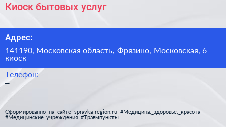 Киоск бытовых услуг по адресу 141190, Московская область, Фрязино, Московская, 6 киоск в дальнейшем Организация, размещена в следующих категориях: