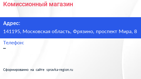 Комиссионный магазин по адресу 141195, Московская область, Фрязино, проспект Мира, 8 в дальнейшем Организация, размещена в следующих категориях: