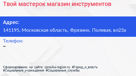 Твой мастерок, магазин инструментов по адресу 141195, Московская область, Фрязино, Полевая, вл23а в дальнейшем Организация, размещена в следующих категориях:
