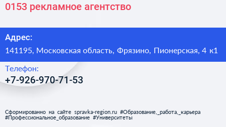 0153, рекламное агентство по адресу 141195, Московская область, Фрязино, Пионерская, 4 к1 в дальнейшем Организация, размещена в следующих категориях: