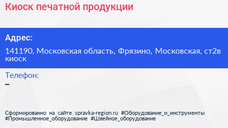 Киоск печатной продукции по адресу 141190, Московская область, Фрязино, Московская, ст2в киоск в дальнейшем Организация, размещена в следующих категориях: