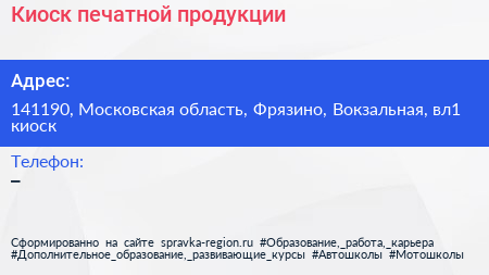 Киоск печатной продукции по адресу 141190, Московская область, Фрязино, Вокзальная, вл1 киоск в дальнейшем Организация, размещена в следующих категориях: