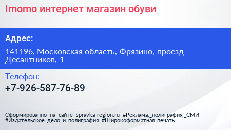 Imomo, интернет-магазин обуви по адресу 141196, Московская область, Фрязино, проезд Десантников, 1 в дальнейшем Организация, размещена в следующих категориях: