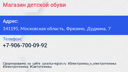 Магазин детской обуви по адресу 141195, Московская область, Фрязино, Дудкина, 7 в дальнейшем Организация, размещена в следующих категориях:
