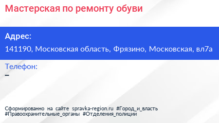 Мастерская по ремонту обуви по адресу 141190, Московская область, Фрязино, Московская, вл7а в дальнейшем Организация, размещена в следующих категориях: