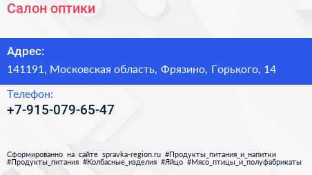 Салон оптики по адресу 141191, Московская область, Фрязино, Горького, 14 в дальнейшем Организация, размещена в следующих категориях: