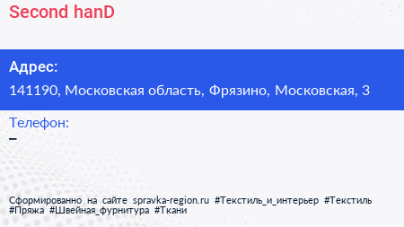 Second hanD по адресу 141190, Московская область, Фрязино, Московская, 3 в дальнейшем Организация, размещена в следующих категориях: