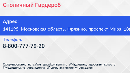 Столичный Гардероб по адресу 141195, Московская область, Фрязино, проспект Мира, 18в в дальнейшем Организация, размещена в следующих категориях: