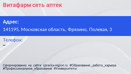 Витафарм, сеть аптек по адресу 141195, Московская область, Фрязино, Полевая, 3 в дальнейшем Организация, размещена в следующих категориях: