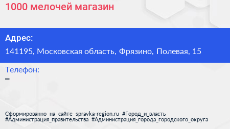 1000 мелочей, магазин по адресу 141195, Московская область, Фрязино, Полевая, 15 в дальнейшем Организация, размещена в следующих категориях: