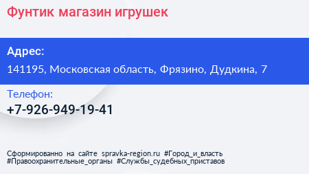 Фунтик, магазин игрушек по адресу 141195, Московская область, Фрязино, Дудкина, 7 в дальнейшем Организация, размещена в следующих категориях: