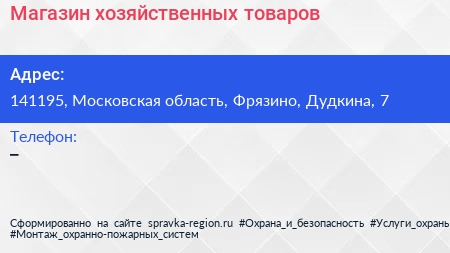 Магазин хозяйственных товаров по адресу 141195, Московская область, Фрязино, Дудкина, 7 в дальнейшем Организация, размещена в следующих категориях: