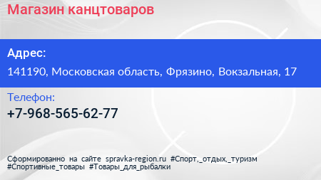 Магазин канцтоваров по адресу 141190, Московская область, Фрязино, Вокзальная, 17 в дальнейшем Организация, размещена в следующих категориях: