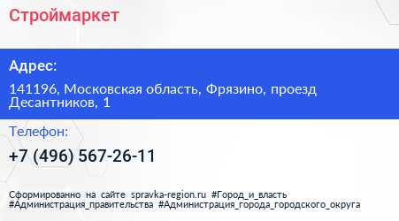 Строймаркет по адресу 141196, Московская область, Фрязино, проезд Десантников, 1 в дальнейшем Организация, размещена в следующих категориях:
