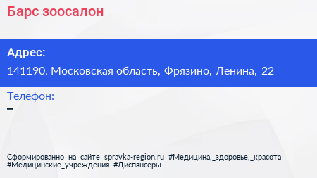 Барс, зоосалон по адресу 141190, Московская область, Фрязино, Ленина, 22 в дальнейшем Организация, размещена в следующих категориях:
