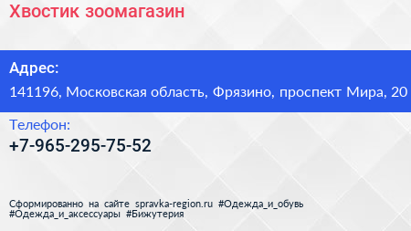 Хвостик, зоомагазин по адресу 141196, Московская область, Фрязино, проспект Мира, 20 в дальнейшем Организация, размещена в следующих категориях: