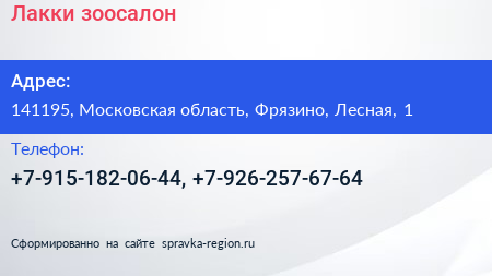 Лакки, зоосалон по адресу 141195, Московская область, Фрязино, Лесная, 1 в дальнейшем Организация, размещена в следующих категориях: