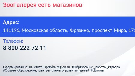ЗооГалерея, сеть магазинов по адресу 141196, Московская область, Фрязино, проспект Мира, 17а в дальнейшем Организация, размещена в следующих категориях: