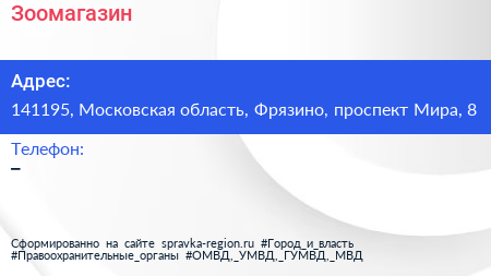 Зоомагазин по адресу 141195, Московская область, Фрязино, проспект Мира, 8 в дальнейшем Организация, размещена в следующих категориях: