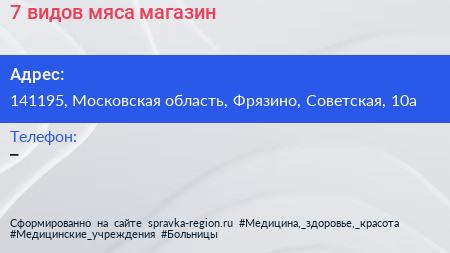 7 видов мяса, магазин по адресу 141195, Московская область, Фрязино, Советская, 10а в дальнейшем Организация, размещена в следующих категориях: