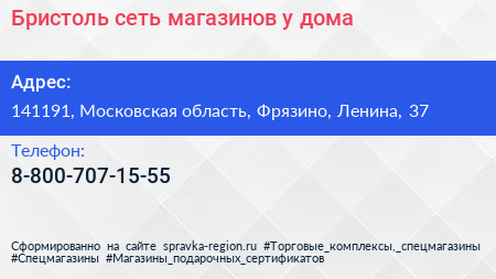 Бристоль, сеть магазинов у дома по адресу 141191, Московская область, Фрязино, Ленина, 37 в дальнейшем Организация, размещена в следующих категориях: