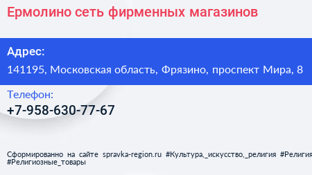 Ермолино, сеть фирменных магазинов по адресу 141195, Московская область, Фрязино, проспект Мира, 8 в дальнейшем Организация, размещена в следующих категориях: