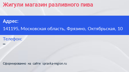 Жигули, магазин разливного пива по адресу 141195, Московская область, Фрязино, Октябрьская, 10 в дальнейшем Организация, размещена в следующих категориях: