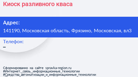 Киоск разливного кваса по адресу 141190, Московская область, Фрязино, Московская, вл3 в дальнейшем Организация, размещена в следующих категориях: