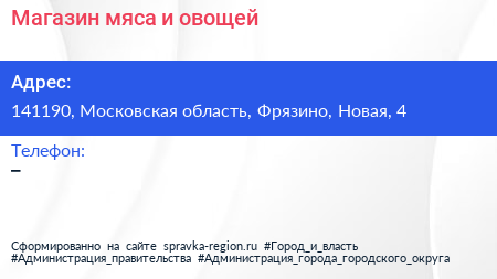 Магазин мяса и овощей по адресу 141190, Московская область, Фрязино, Новая, 4 в дальнейшем Организация, размещена в следующих категориях: