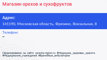 Магазин орехов и сухофруктов по адресу 141190, Московская область, Фрязино, Вокзальная, 8 в дальнейшем Организация, размещена в следующих категориях: