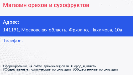 Магазин орехов и сухофруктов по адресу 141191, Московская область, Фрязино, Нахимова, 10а в дальнейшем Организация, размещена в следующих категориях: