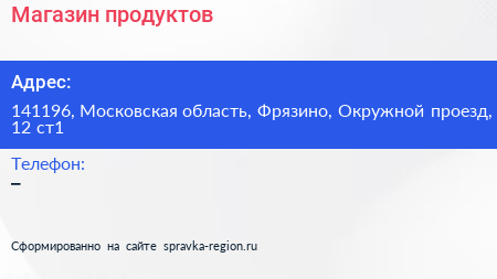 Магазин продуктов по адресу 141196, Московская область, Фрязино, Окружной проезд, 12 ст1 в дальнейшем Организация, размещена в следующих категориях: