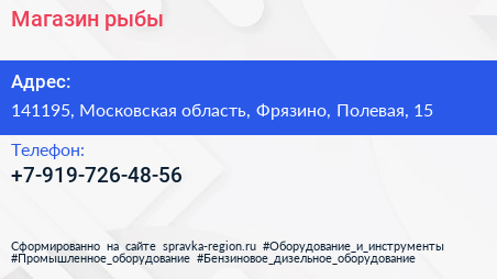 Магазин рыбы по адресу 141195, Московская область, Фрязино, Полевая, 15 в дальнейшем Организация, размещена в следующих категориях: